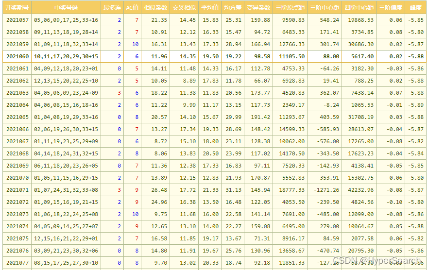 (1)统计:首先需要对数据集进行计算,包括和值、均值、标准差、均方差、跨度(最大号-最小号)、奇偶比(奇数个数比偶数个数,后面类似)、大小比、质合比(质数与合数的比。有个数学问题:1是质数?或是合数?)等等,一般的彩票网站都可以提供几十种统计数据。这个都是数学哈!