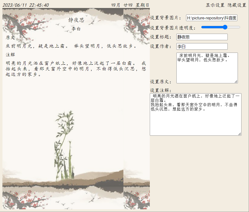 以前喜欢发抖音,内容是一些古诗文,然后找不到合适模板,于是自己就写了一个小工具,功能如下: 时间展示、支持选择背景、设置背景的透明度、设置古诗文题目、设置古诗文内容、设置古诗文译文。当设置好了以后,使用截图工具,把内容裁剪出来,然后就可以将图片发布到抖音平台或者公众号平台了。