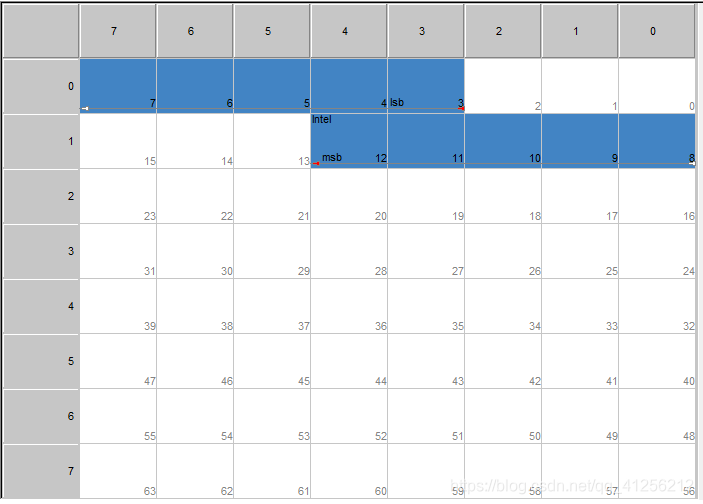 Intel格式跟小端格式一样,低地址代表低字节,高地址代表高字节。比如一个信号Intel,它的起始位为3,长度为10,在dbc中它的排列顺序如下所示: