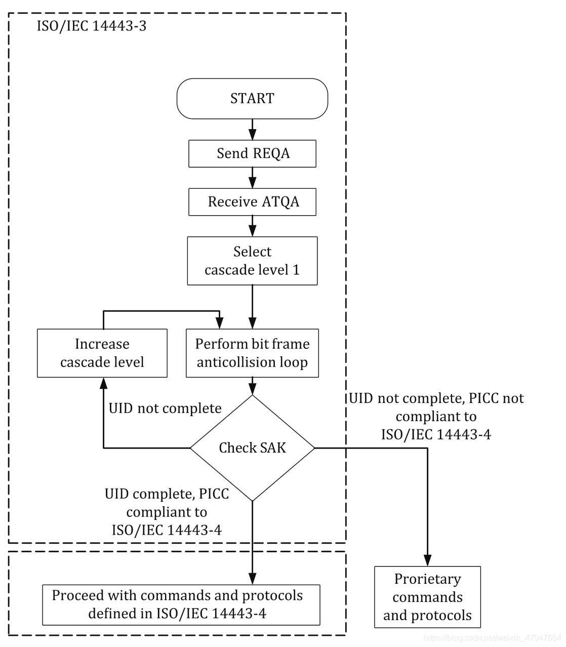 查阅IEC14443-3/A规范得知卡片读取流程如下: