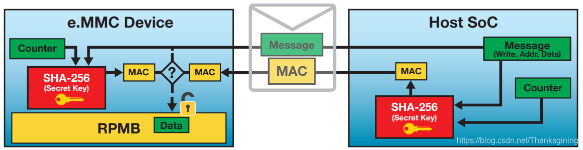 eMMC设备将读取的数据连同MAC签名一起发送到主机。主机接收消息并使用共享密钥生成MAC。只有当两个mac相同时,主机才会信任从RPMB读取的数据。