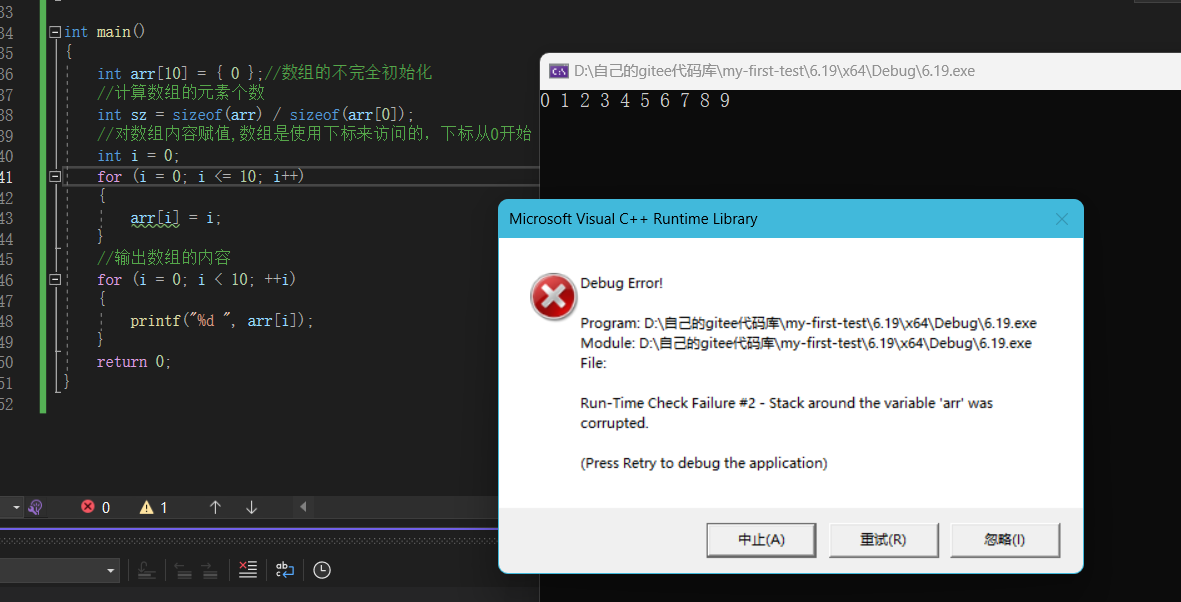所以数组的下标如果小于0,或者大于n-1,就是数组越界访问了,超出了数组合法空间的访问。