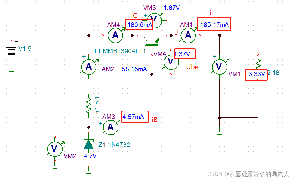 可以看到,输出的电压并不是我们想要的结果,存在一定的偏差,主要是因为基极-发射极的压降不是理想的0.7V,而是0.8843V,基极-发射极的压降跟集电极电流(37.98mA)存在一定的关系。