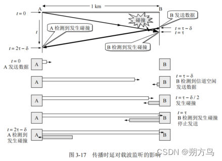 在 t = t - d 时(这里t > d > 0),A 发送的数据还没有到达B 时,由于B 检测到信道是空闲的,因此 B 发送数据。