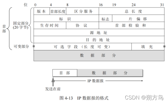 一个 IP 数据报由首部和数据两部分组成。首部的前一部分是固定长度,共 20 字节,是所有 IP 数据报必须具有的。在首部的固定部分的后面是一些可选字段, 其长度是可变的。下面介绍首部各字段的意义。