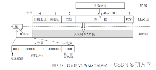 MAC 帧较为简单,由五个字段组成。前两个字段分别为 6 字节长的目的地址和源地址字段。第三个字段是 2 字节的类型字段,用来标志上一层使用的是什么协议,以便把收到的 MAC 帧的数据上交给上一层的这个协议。第四个字段是数据字段,其长度在46到1500 字节之间。最后一个字段是 4 字节的帧检验序列 FCS(使用 CRC 检验)。