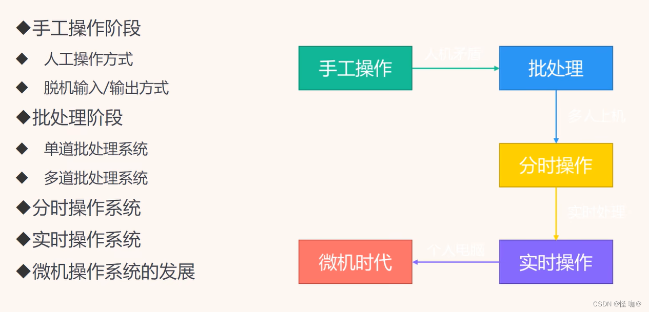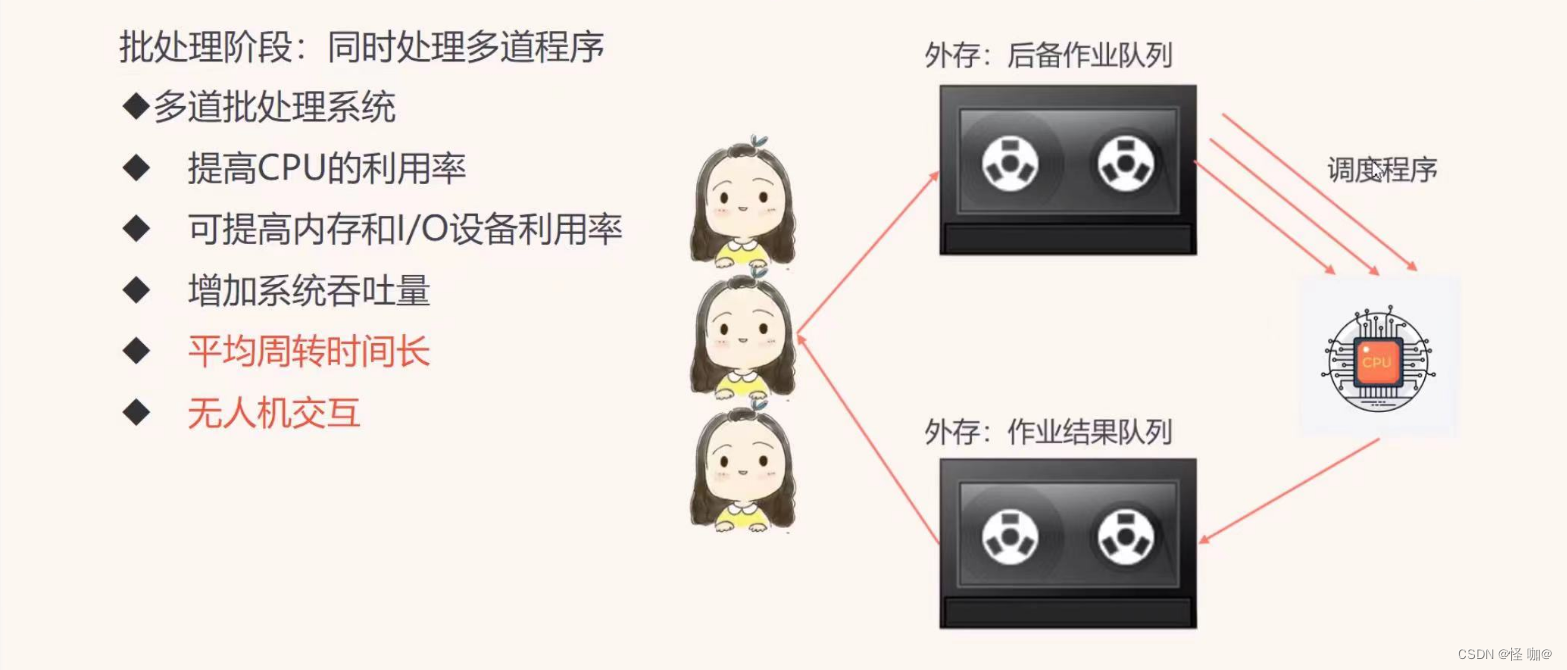 - 主要缺点:用户响应时间长,没有人机交互功能(用户提交自己的作业之后只能等待计算机处理完成,中间不能控制自己作业的执行)