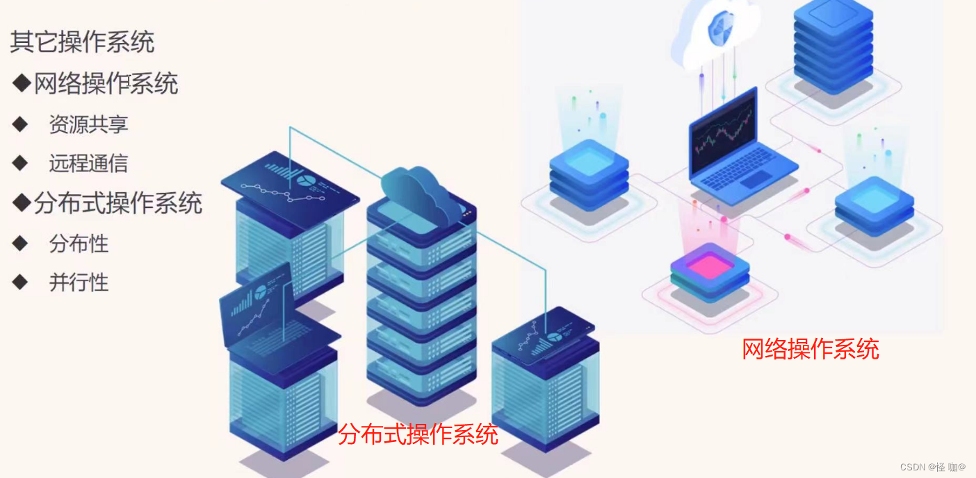 - 分布式操作系统: 主要特点是分布性和并行性,系统之中的各台计算机地位相同,任何工作都可以分布在这些计算机上,他们并行、协同完成这个任务。