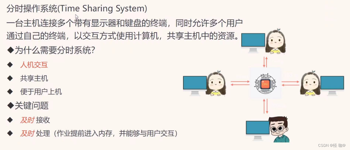 计算机以时间片为单位轮流为各个用户/作业服务,各个用户可通过终端与计算机进行交互。(时间片就是一个很短的时间,比如50ms)