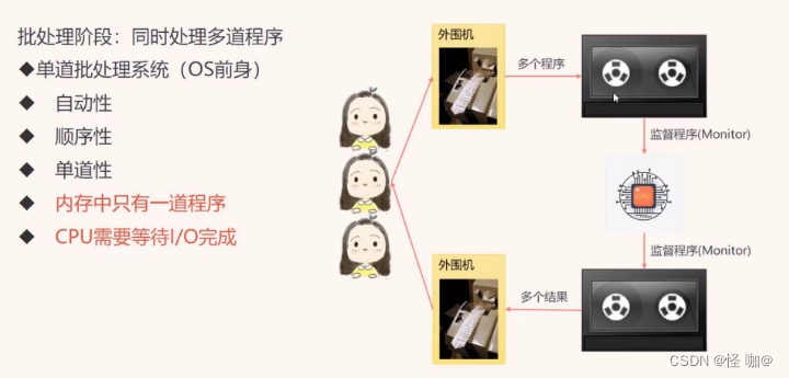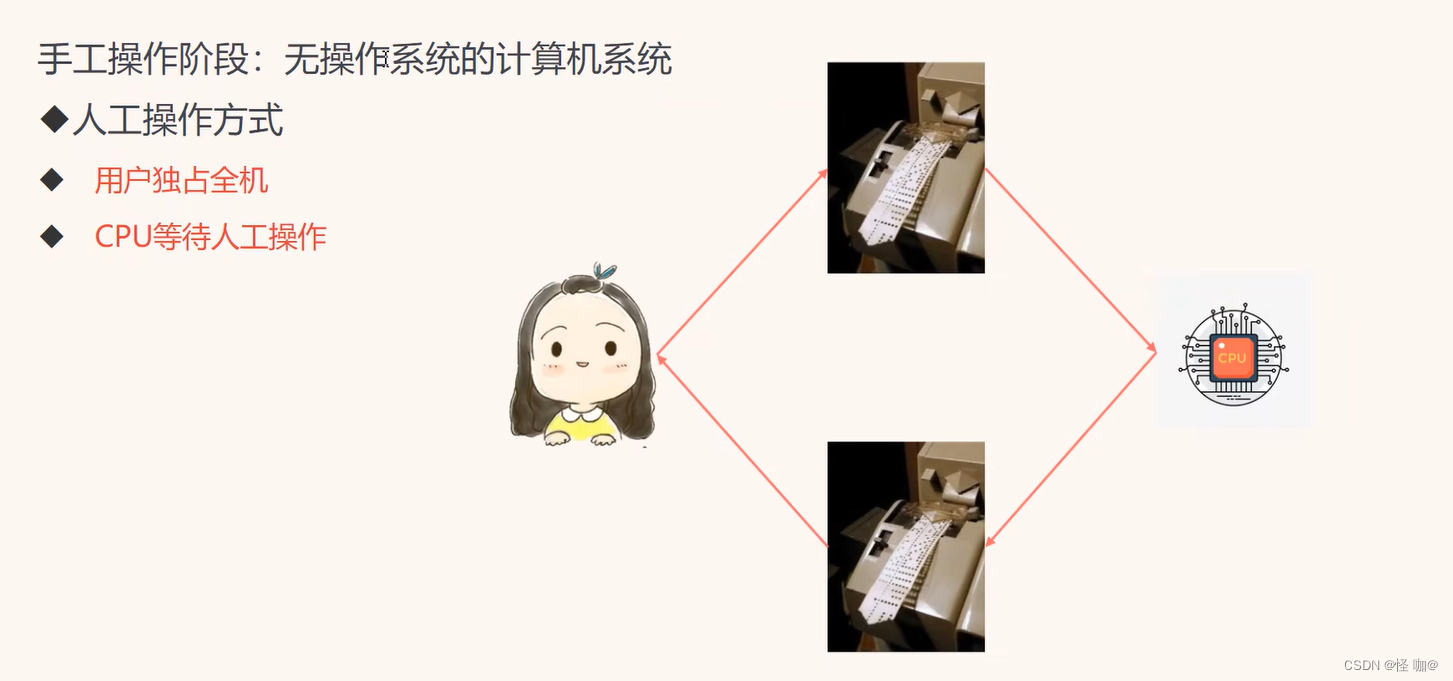 最初的时候计算机所有的操作都需要人工进行干预的,输入和输出都需要通过外围机(就是在纸带上打孔的设备),使用者通过外围机将指令打给cpu进行处理,然后cpu再将结果通过外围机打印出来返回给使用者。