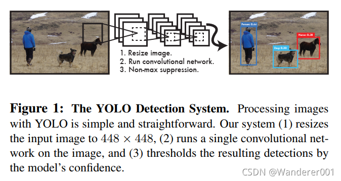 YOLO非常简单:请参见图1。一个卷积网络可以同时预测多个边界框和这些框的类概率。YOLO对完整图像进行训练,并直接优化检测性能。与传统的目标检测方法相比,这种统一模型有几个优点。