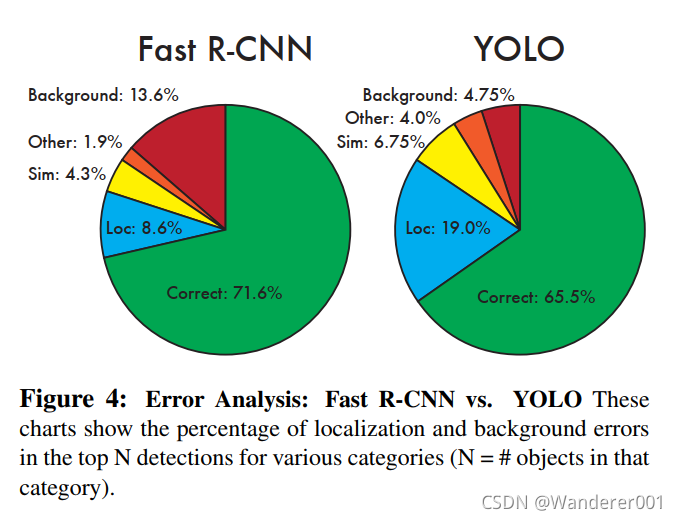 YOLO努力正确地本地化对象。 本地化错误占YOLO错误的比例超过了所有其他来源的总和。 Fast R-CNN使更少的本地化错误,但更多的背景错误。 13.6%的顶级检测是不包含任何物体的假阳性。 Fast R-CNN预测背景检测的可能性几乎是YOLO的3倍。