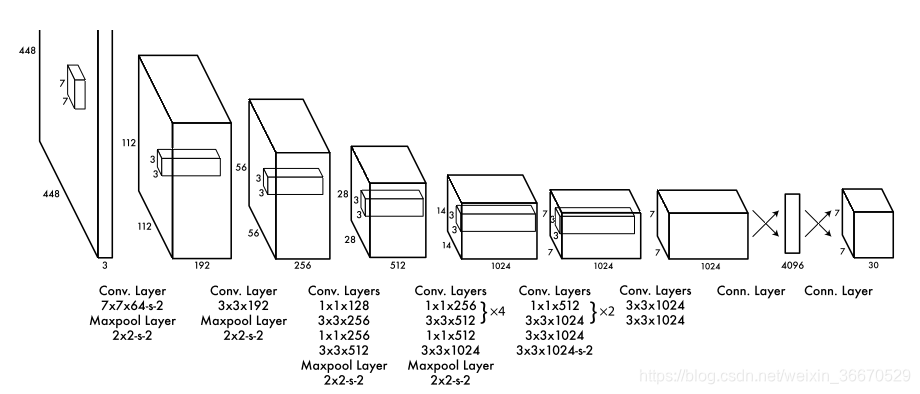 首先网络的卷积层从图像中提取特征,全连接层预测输出的概率和坐标。网络模型来源于GoogLeNet图像分类的思想。由24个卷积层外加两个全连接层。和GoogLeNet中使用inception模块有所不同,在3x3卷积层的后面,这个网络仅仅使用1x1来减少卷积层,和NIN网络类似,整个网络结构如下图: