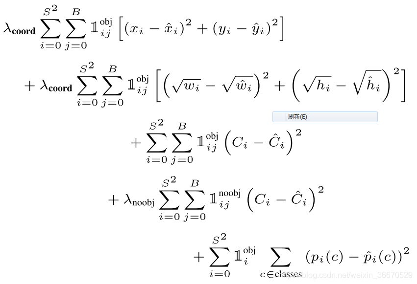 这个公式给每个框一个类别置信分数。这些使得类别的概率出现在盒子中,并且很好的预测了框是否为目标。