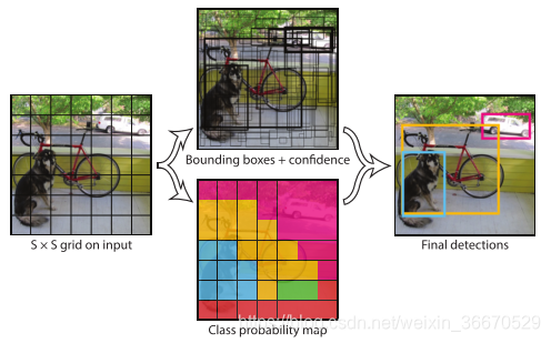 系统将输入分成SxS的格子。如果目标的中心落在这个格子内,这个格子就对这个目标负责。