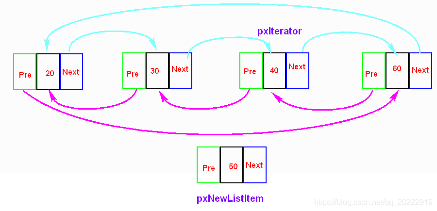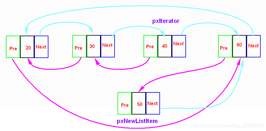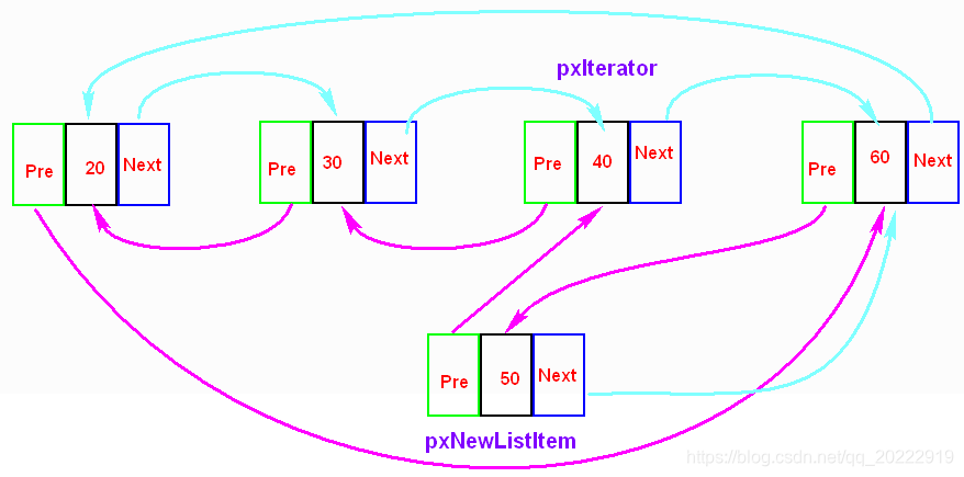 pxNewListItem->pxNext->pxPrevious = pxNewListItem;//pxNewListItem->pxNext就是60 60->pre ->50