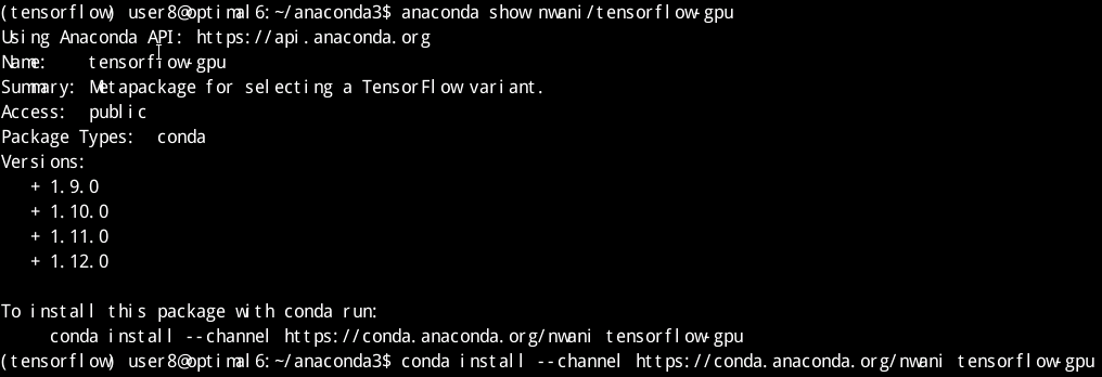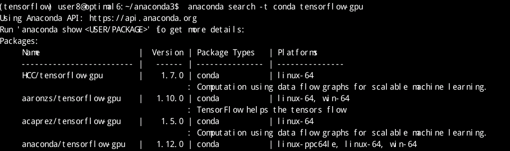 anaconda search -t conda tensoflow-gpu这是anaconda中查找安装包的通用命令,若要安装别的开发包,conda后面搜索别的开发包即可,例如opencv,ffmpeg等,搜索到的开发包如下: