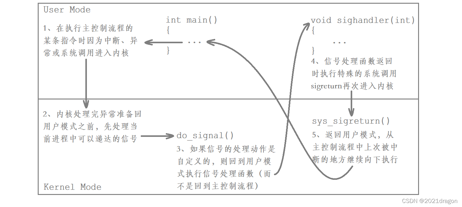 signum代表指定信号的编号。若act指针非空,则根据act修改该信号的处理动作。若oldact指针非空,则通过oldact传出该信号原来的处理动作。