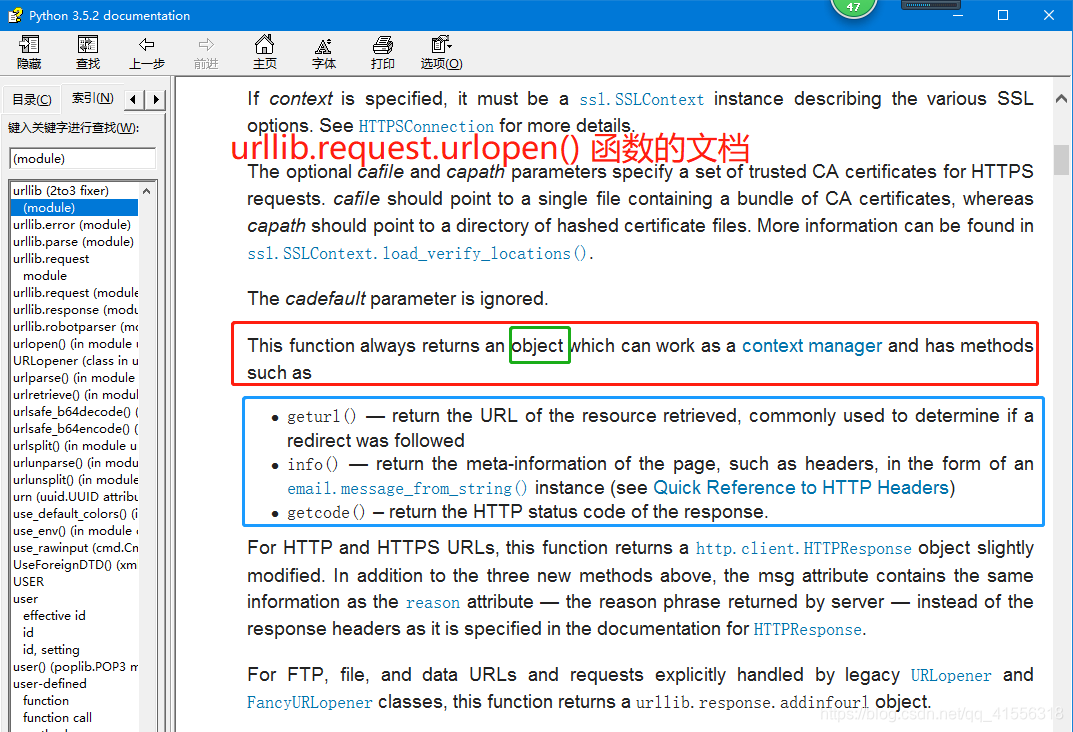 另外,urlopen() 函数返回的 response 其实是一个对象(object),看下图文档解释,因此你可以使用 read() 方法来读取内容,