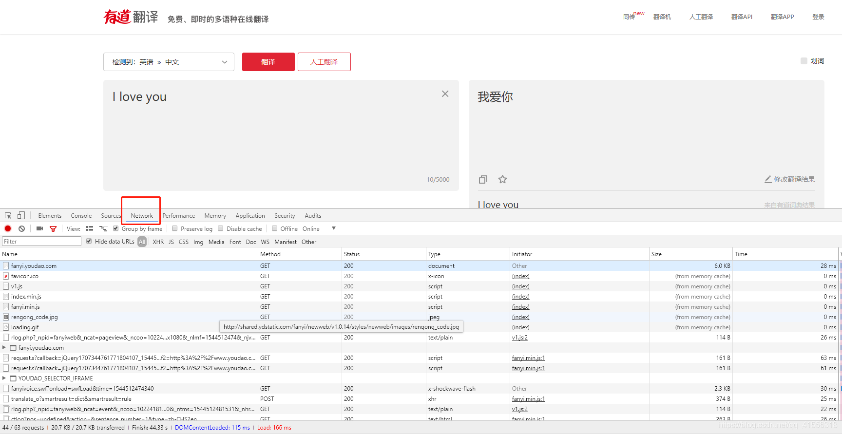 我们要看的是 Network 这一块,当我们点下自动翻译按钮时,在下面会看到有很多 Method,其中有 Get , 有Post ,这些内容都是浏览器与客户端的通信内容,在客服端与服务器之间进行请求的时候,两种最常用的方法:一种就是Get,一种就是 Post,在定义上来说,Get是指从服务器请求获得数据,而Post是向指定服务器提交被处理的数据,当然在现实情况中,Get也常常用作提交数据。但是我们这里有 Post,刚刚我们是提交数据,提交 I love you!这个语句让它翻译,我们点进去: