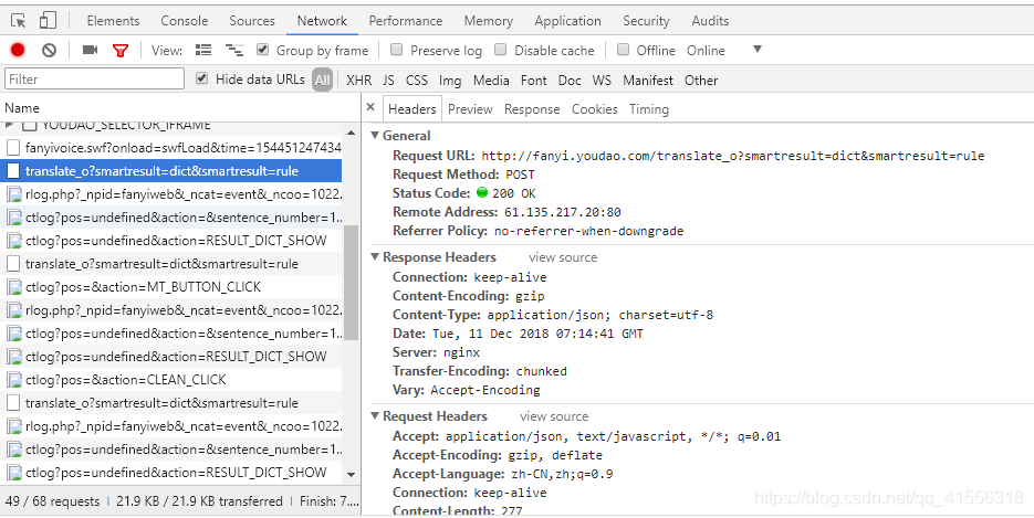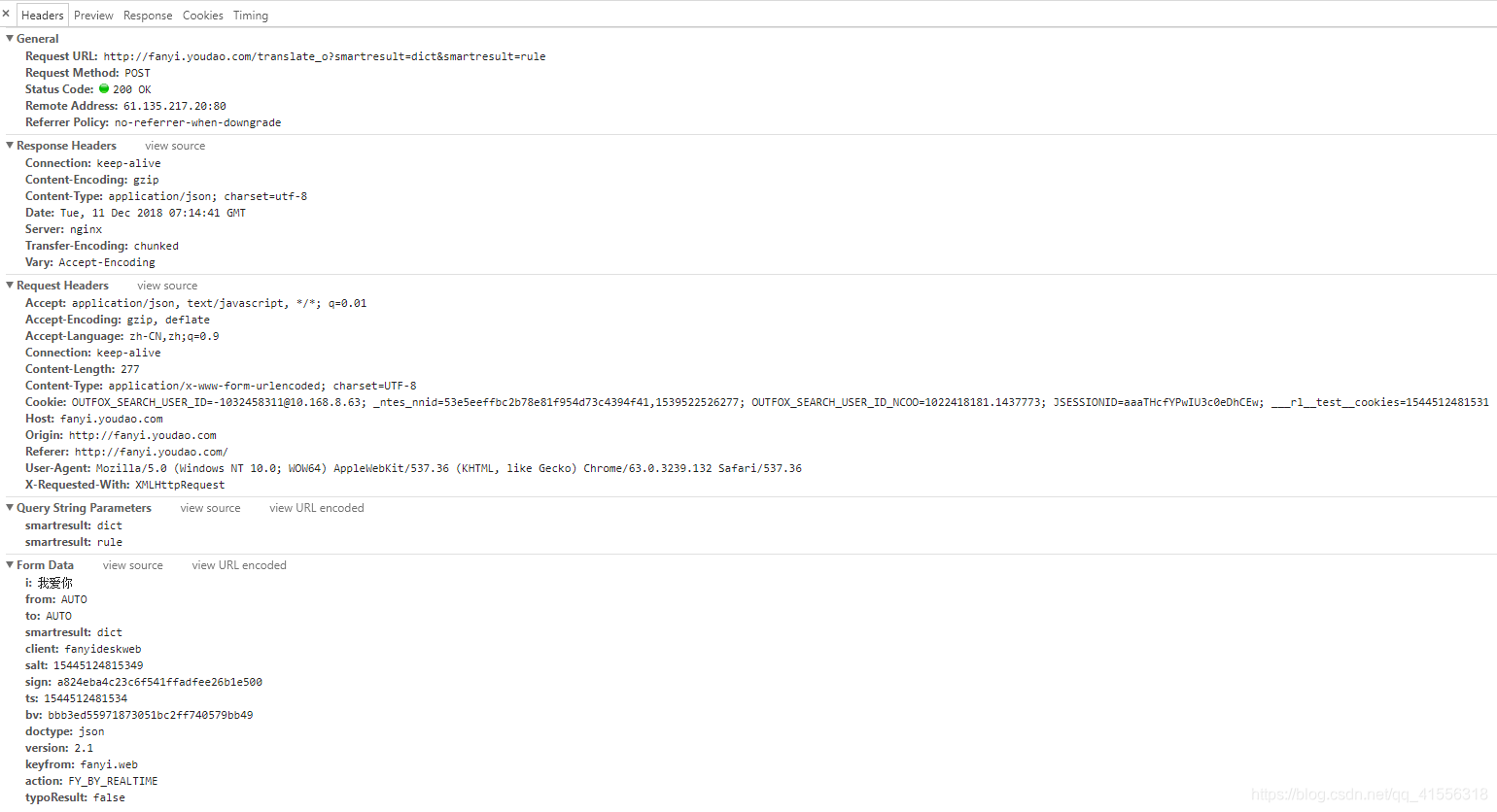 Form Data:其实就是我们这个Post提交的主要内容,在 i 这里看到了提交的待翻译的内容。