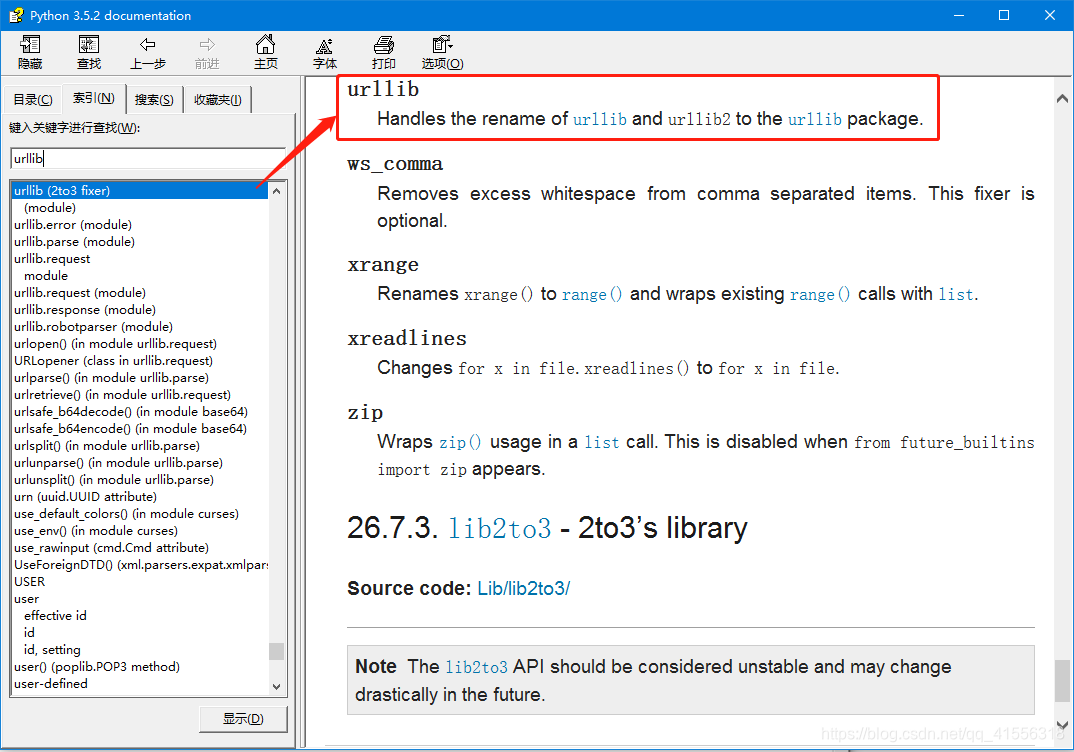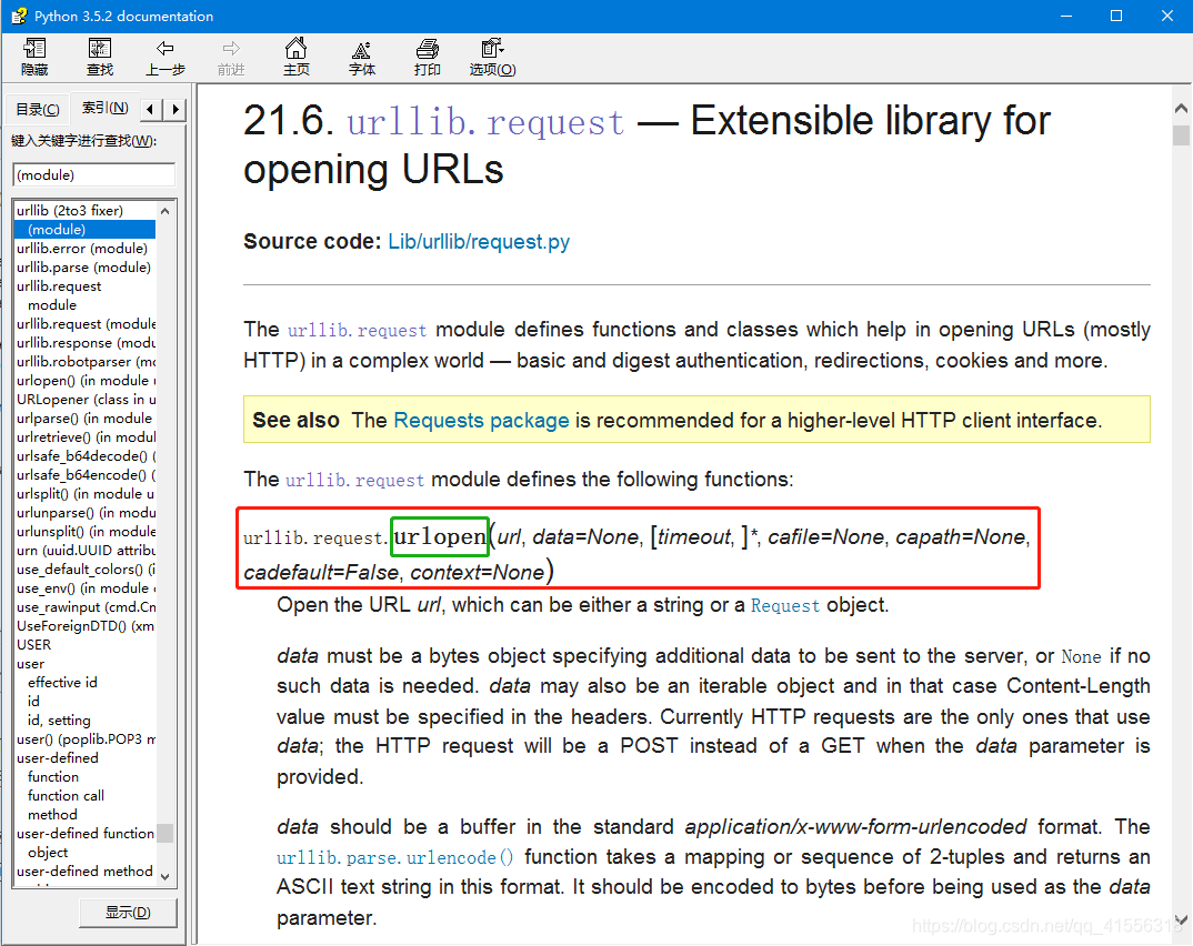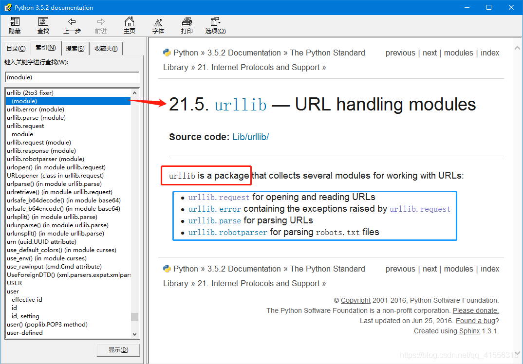 那好,说完URL,我们现在可以来谈一下 urllib 这个模块了,Python 3 其实对这个模块进行了挺大的改动,以前有urllib和urllib2 两个模块,Python3 干脆把它们合并在了一起并做了统一。其实 urllib 并不是一个模块,而是一个包。我们来查一下文档就知道了(我们说过,有问题,找文档。)