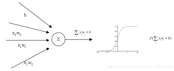 如果将每一个神经元(也就是神经网络中的节点)的输出通过一个非线性函数,那么整个神经网络的模型就不再是线性了。这个非线性函数就是激活函数。下图显示了加入激活函数和偏置项之后的神经元结构。