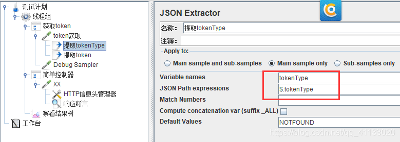 我们需要用到正则表达式提取器或者josn提取器(因为返回的josn数据),也许还有其它方法。我这里用的是Josn Extractor,类似这样。