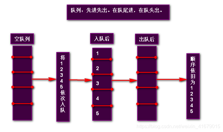 限定仅在表尾进行插入和在表头进行删除操作的线性表,表尾称为队尾,表头称为队头,数据元素先进先出,英文缩写FIFO