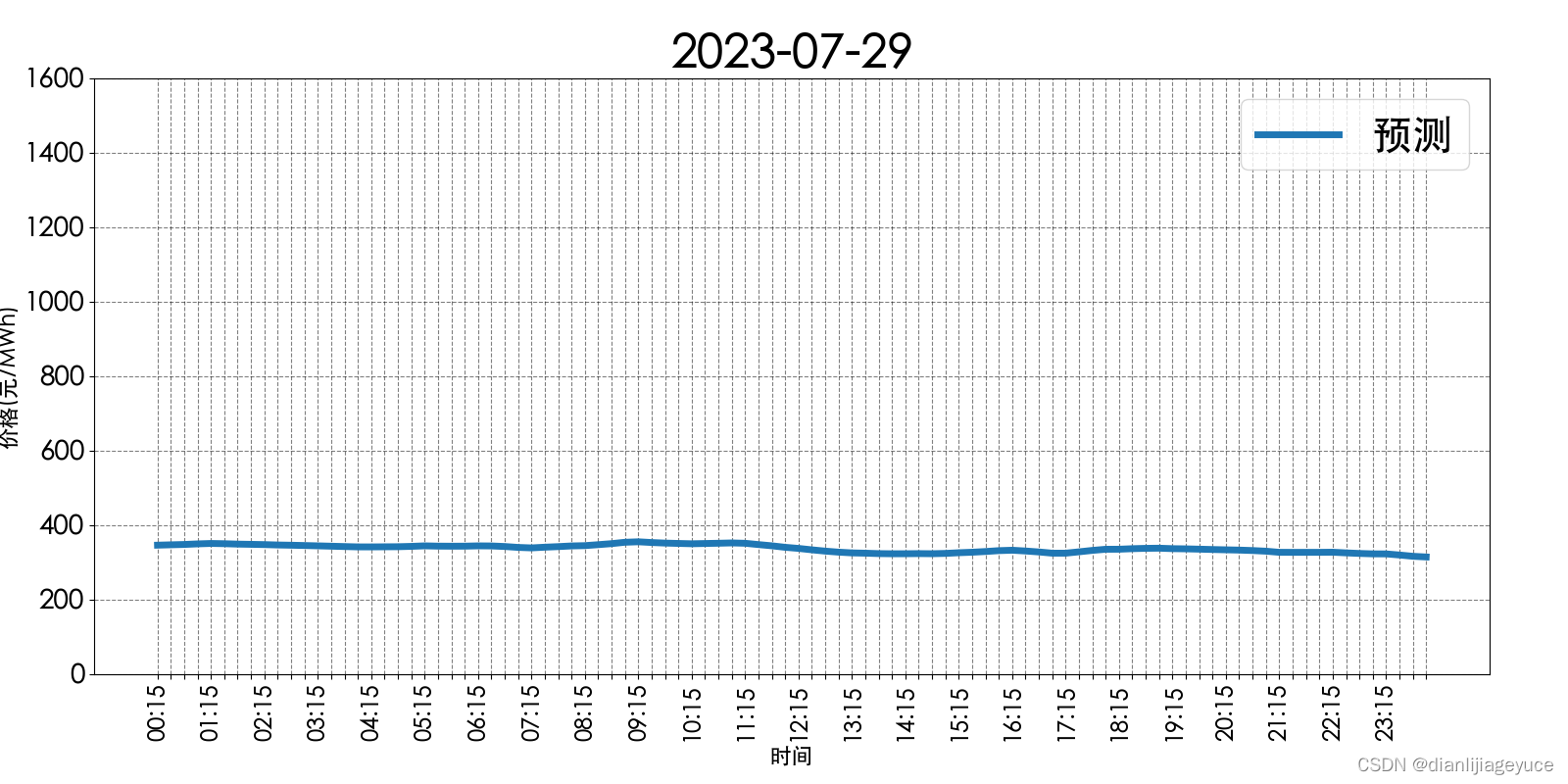 预测明日(2023-07-29)山西电力市场全天平均日前电价为337.82元/MWh。其中,最高日前电价为355.66元/MWh,预计出现在09: 15。最低日前电价为314.90元/MWh,预计出现在24: 00。
