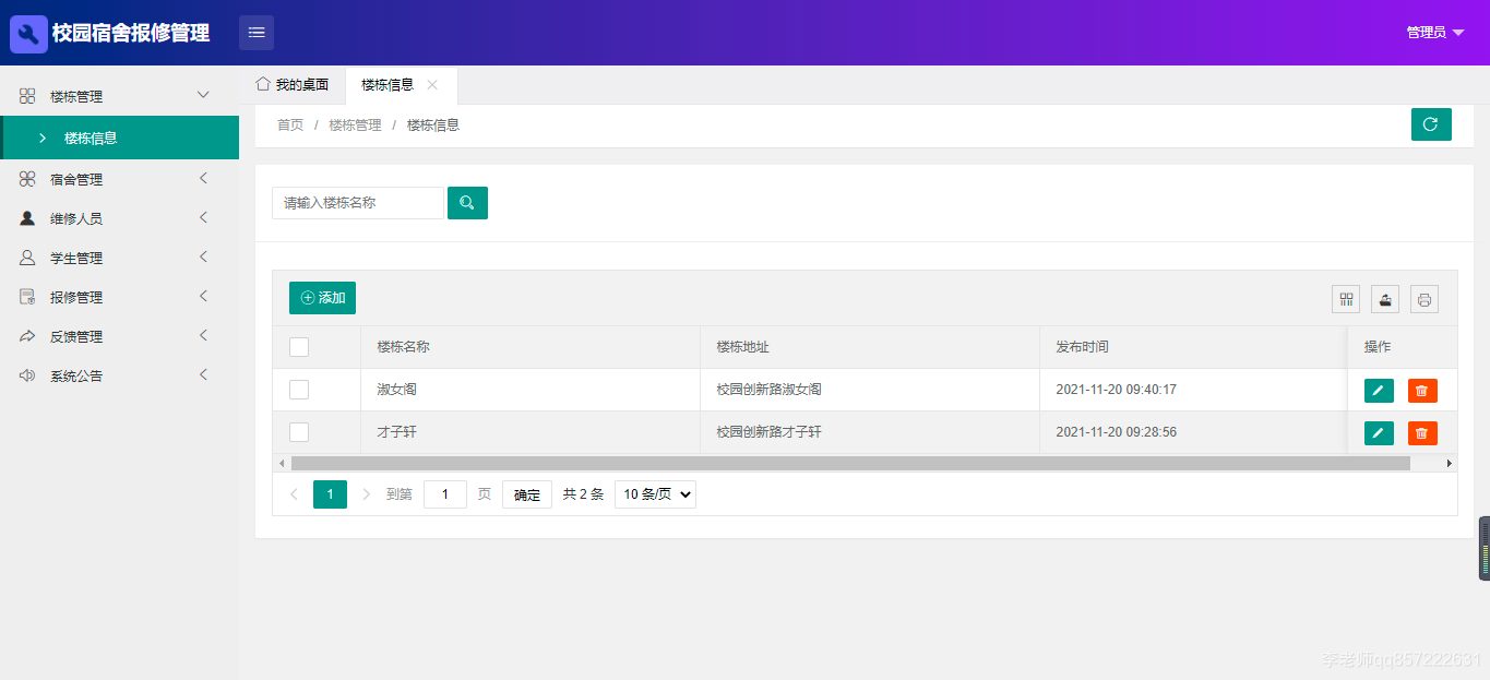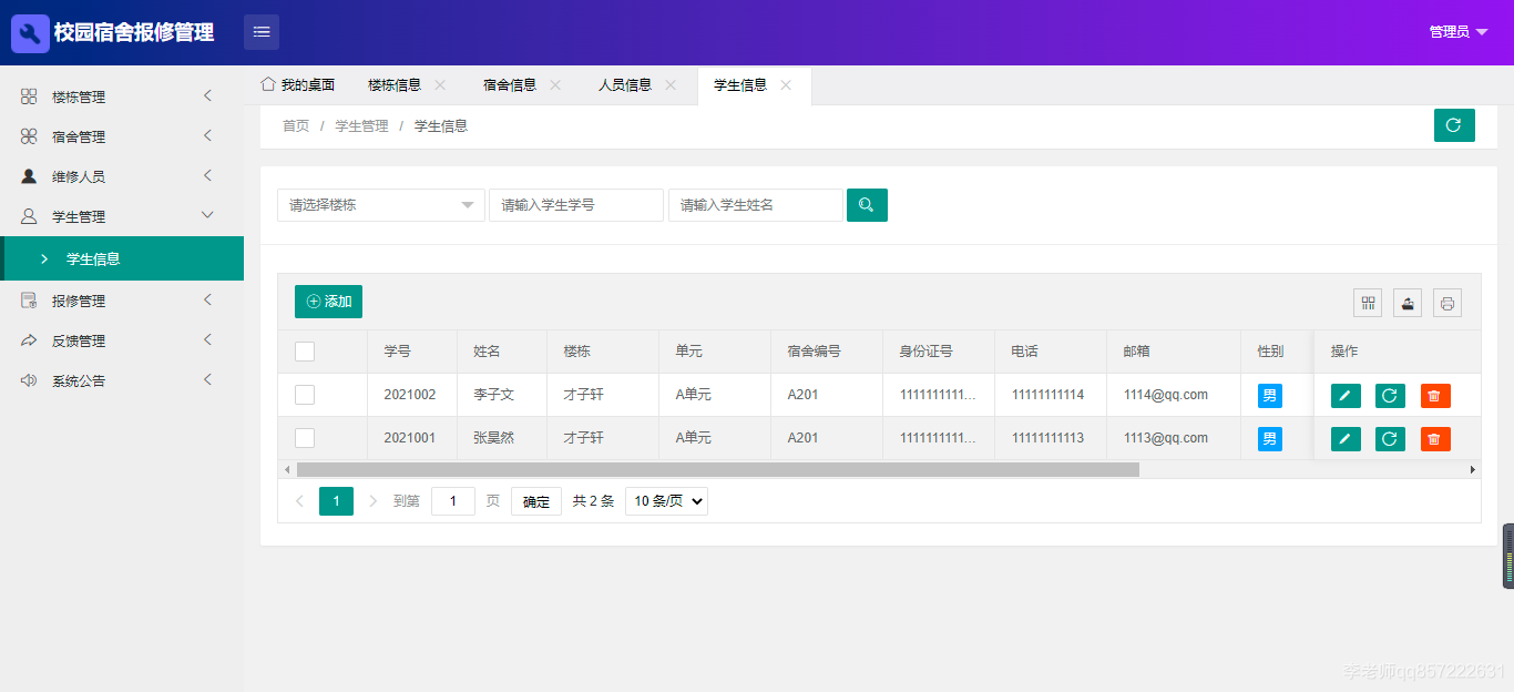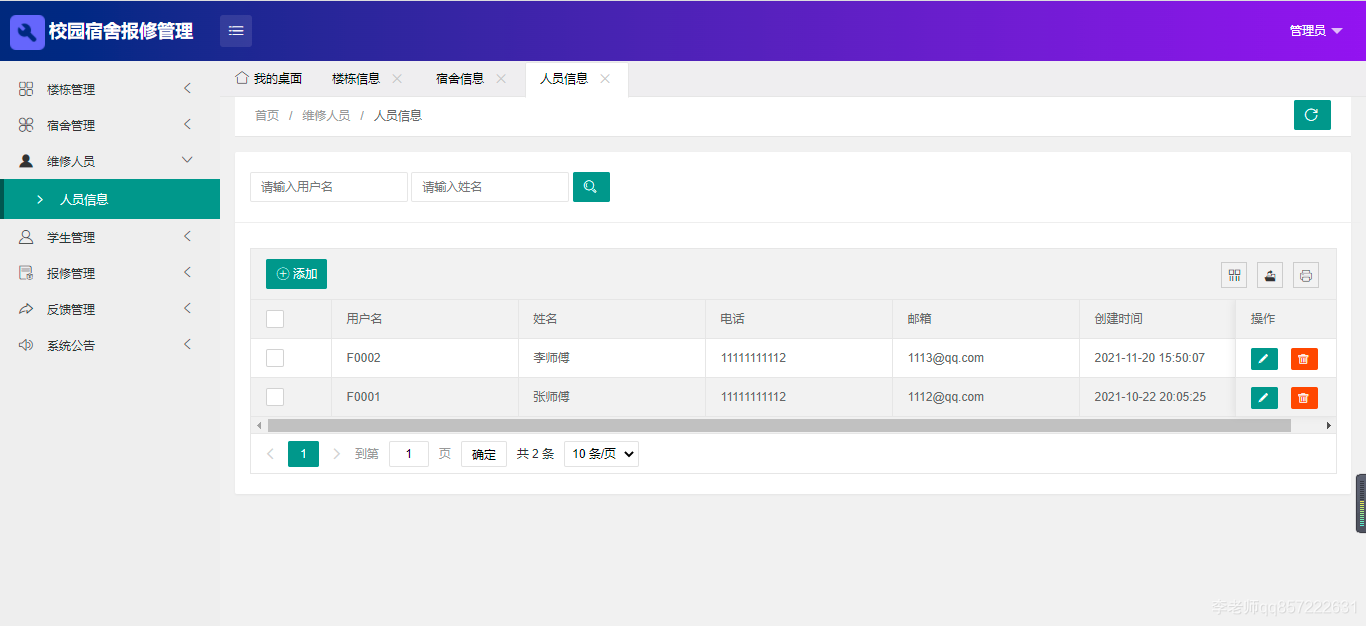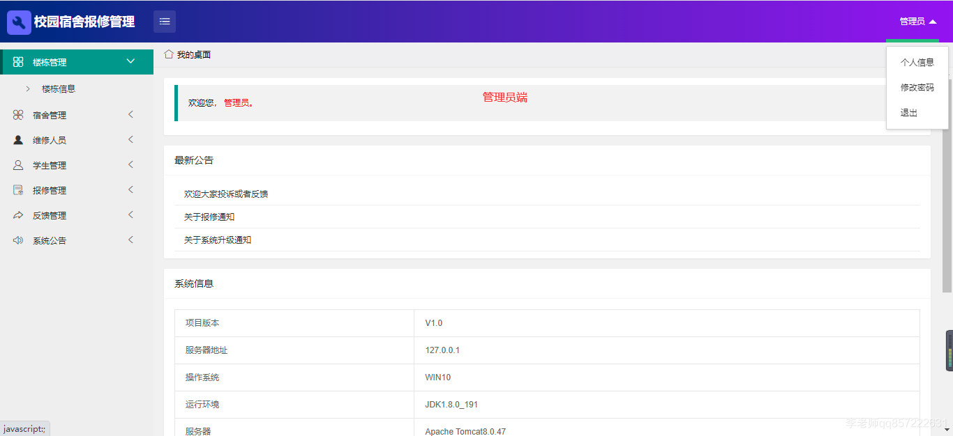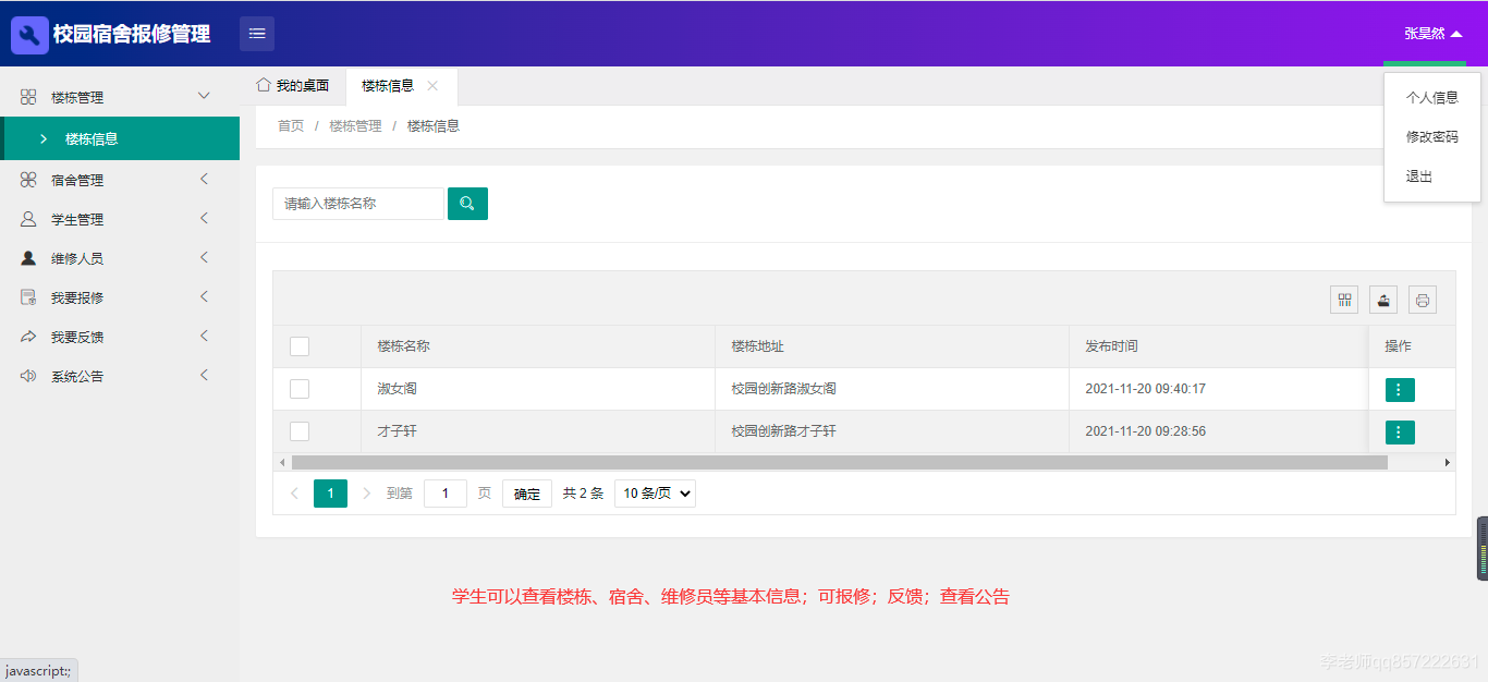 员工:楼栋查看;宿舍查看;学生查看;维修人员;我要报修;我要反馈;系统公告;个人信息修改;密码修改;