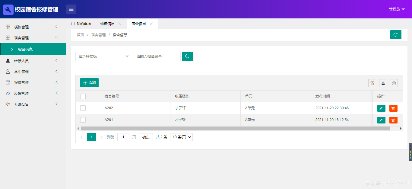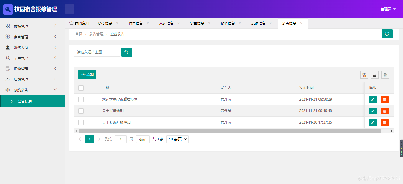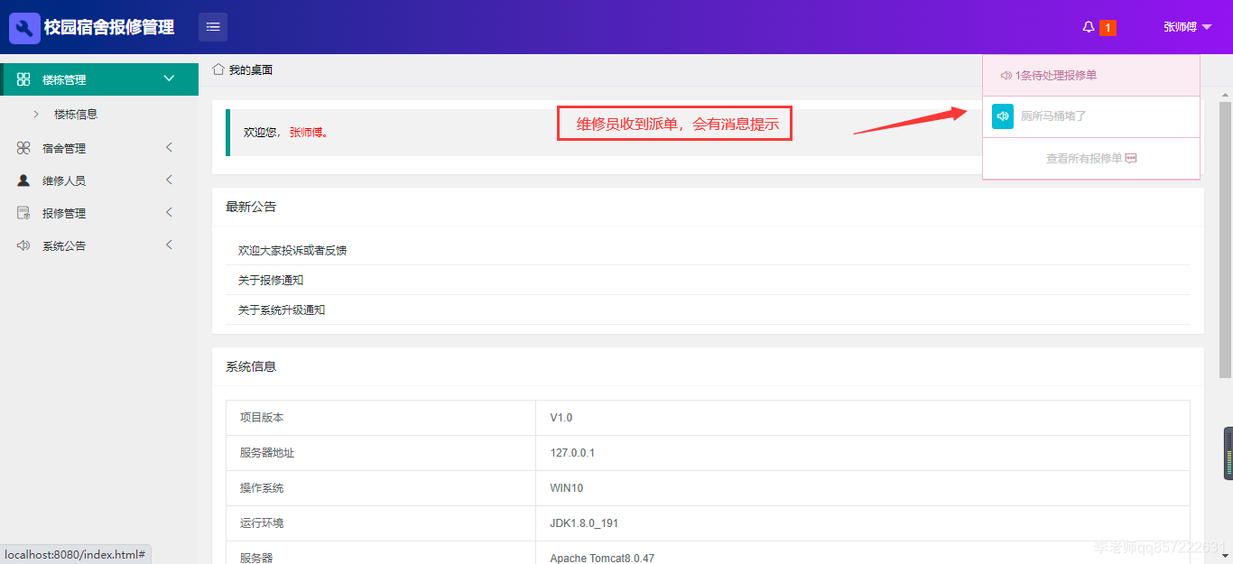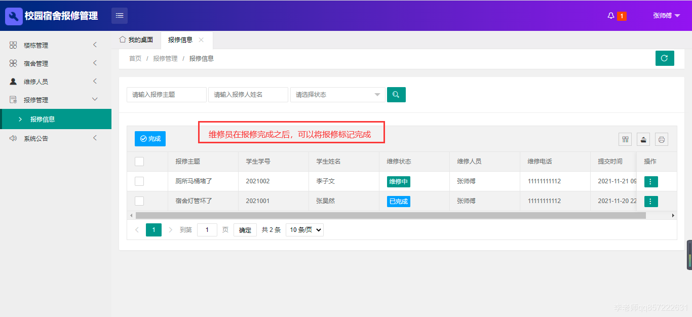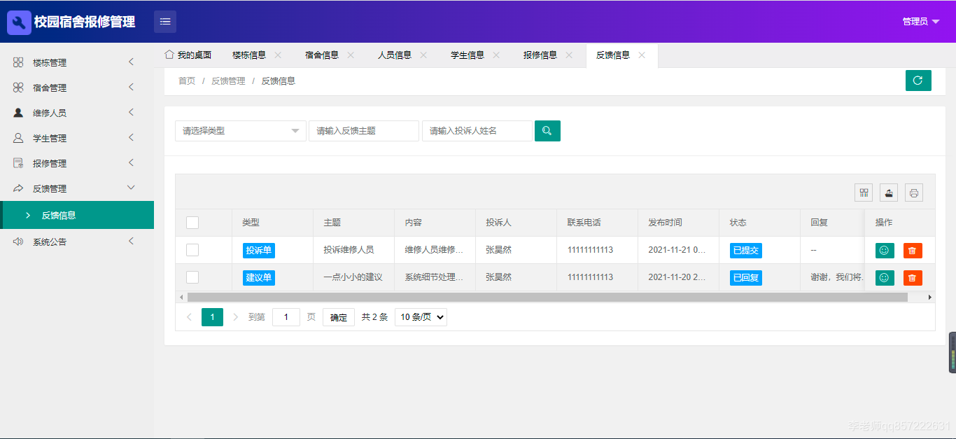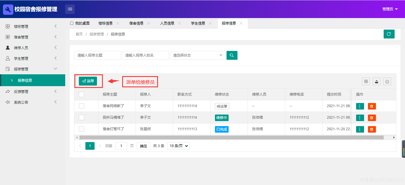 使用java+springboot+mysql开发的校园宿舍报修管理系统,系统包含管理员、维修员、学生角色,功能如下: