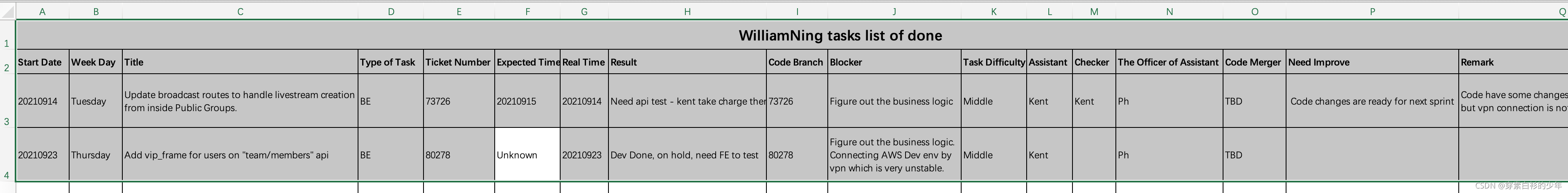 Start Date Week Day Title Type of Task Ticket Number Expected Time Real Time Result Code Branch Blocker Task Difficulty Assistant Checker The Officer of Assistant Code Merger Need Improve Remark 20210914 Tuesday Update broadcast routes to handle livestream creation