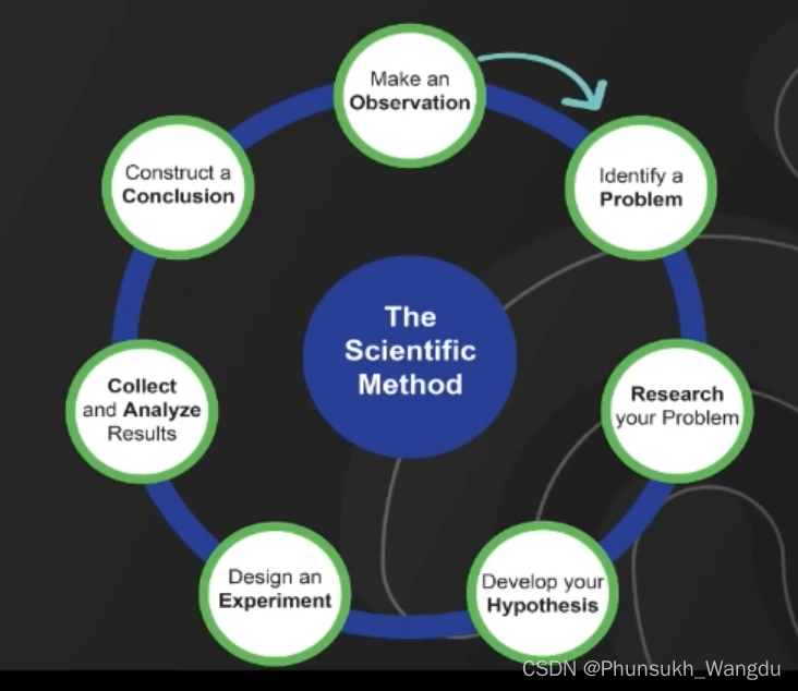 Anwser:科研是【进行观察—>定义问题—>研究问题—>发展假设—>设计实验—>收集和分析结果—>构建结论—>进行观察】这样一个循环。