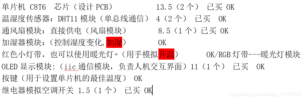 2.拿到一个题目,第一需要明白的就是,哪些功能是必须要做的(很重要很重要很重要)。温湿度控制,那肯定就必须要有温湿度检测,以及温湿度控制两个部分,缺一不可,注意,这里还包含一个隐藏要求:人机交互。既然是一个题目,就会涉及最后的验收,所以显示屏是必不可少的,总计三个板块。