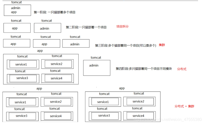 2. 分布式: 多个服务器部署一个项目的不同模块。