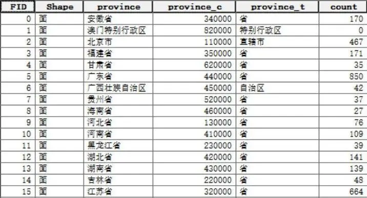 我们先来看一下Shp格式的数据,34个省份A股上市企业数量汇总在一个Shp文件中,数据字段主要包括省份名称(province)、省代码(province_c)、省份类型(province_t)、企业数量(count)。