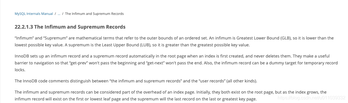 Infimum & Supremum : Page 里面两条预制的记录 infimum 和 supremum, 分别表示 record 链表逻辑上的 head 和 tail