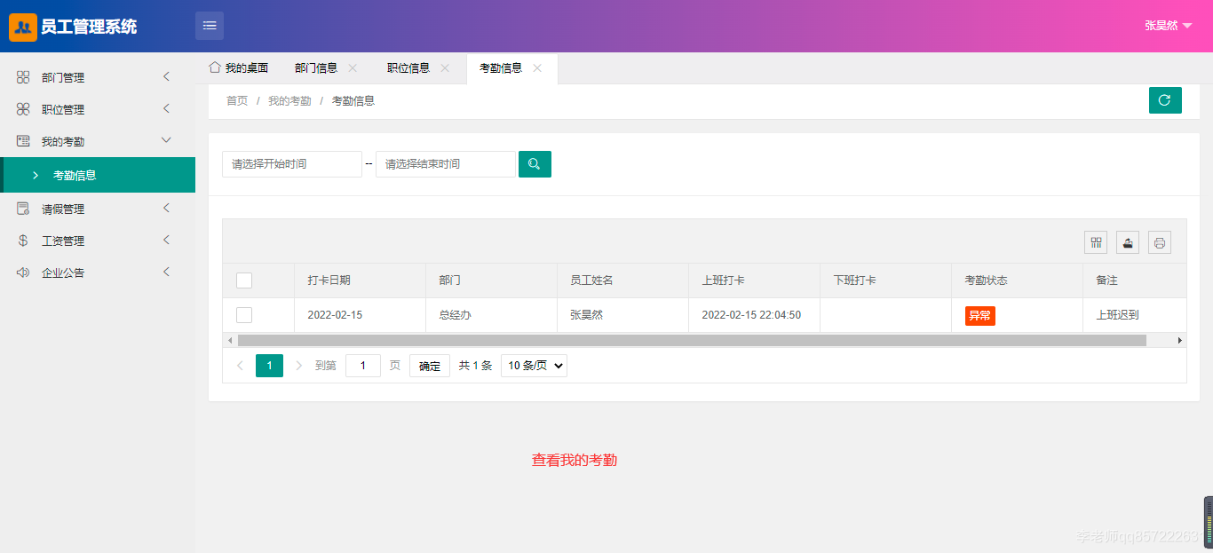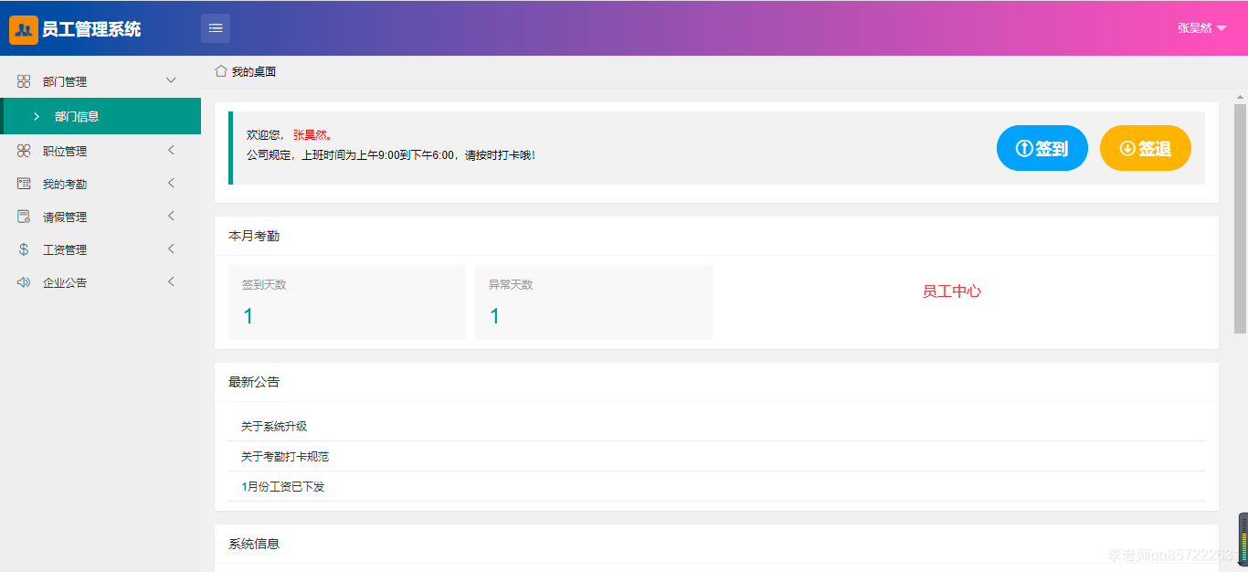 用户:部门查看;职位查看;我的考勤;请假管理;工资查看;企业公告;个人信息、密码修改;