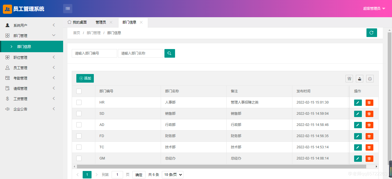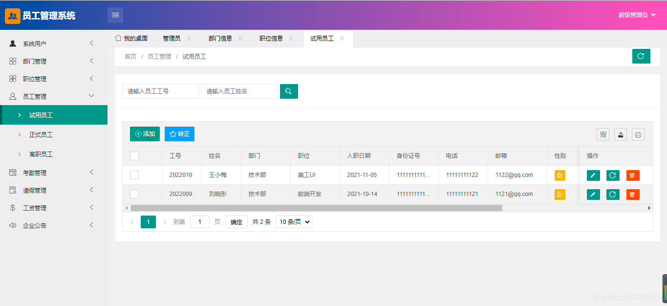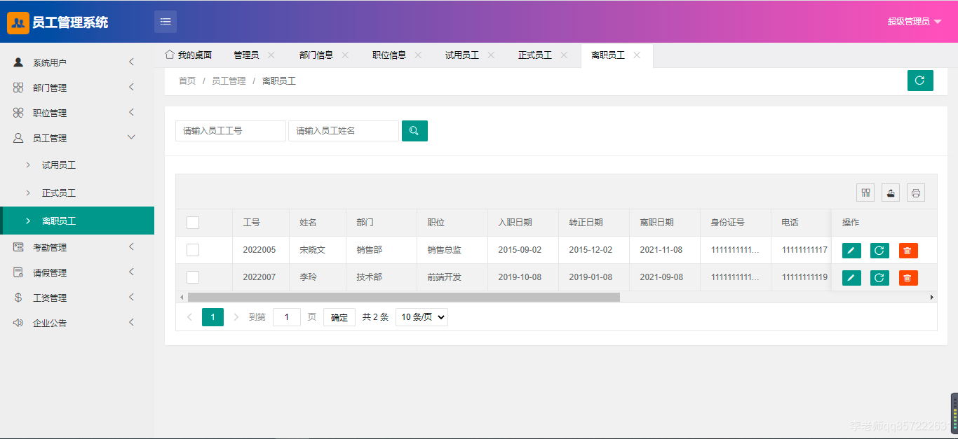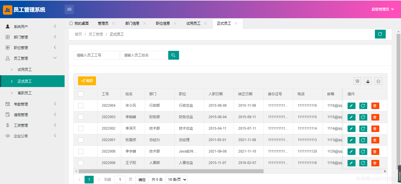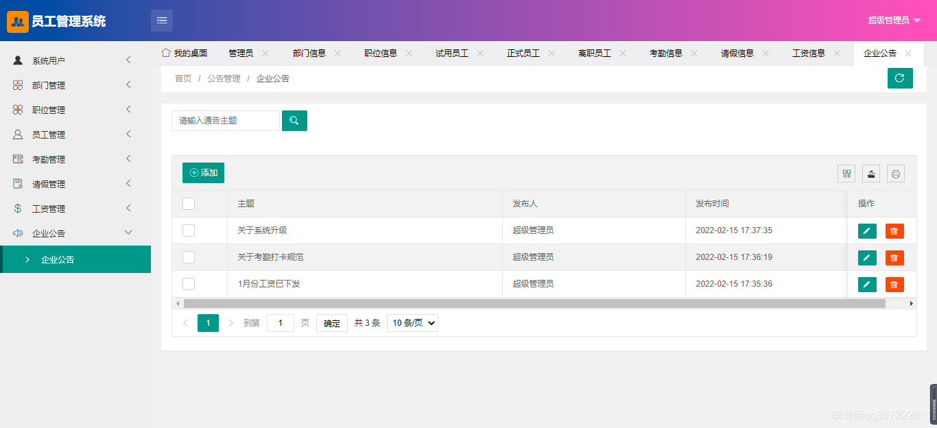 使用java+springboot+mysql开发的员工管理系统(人力资源管理系统),系统包含超级管理员、管理员、员工角色,功能如下: