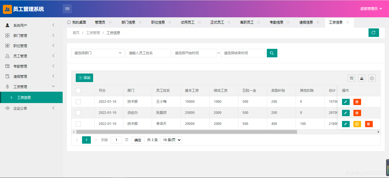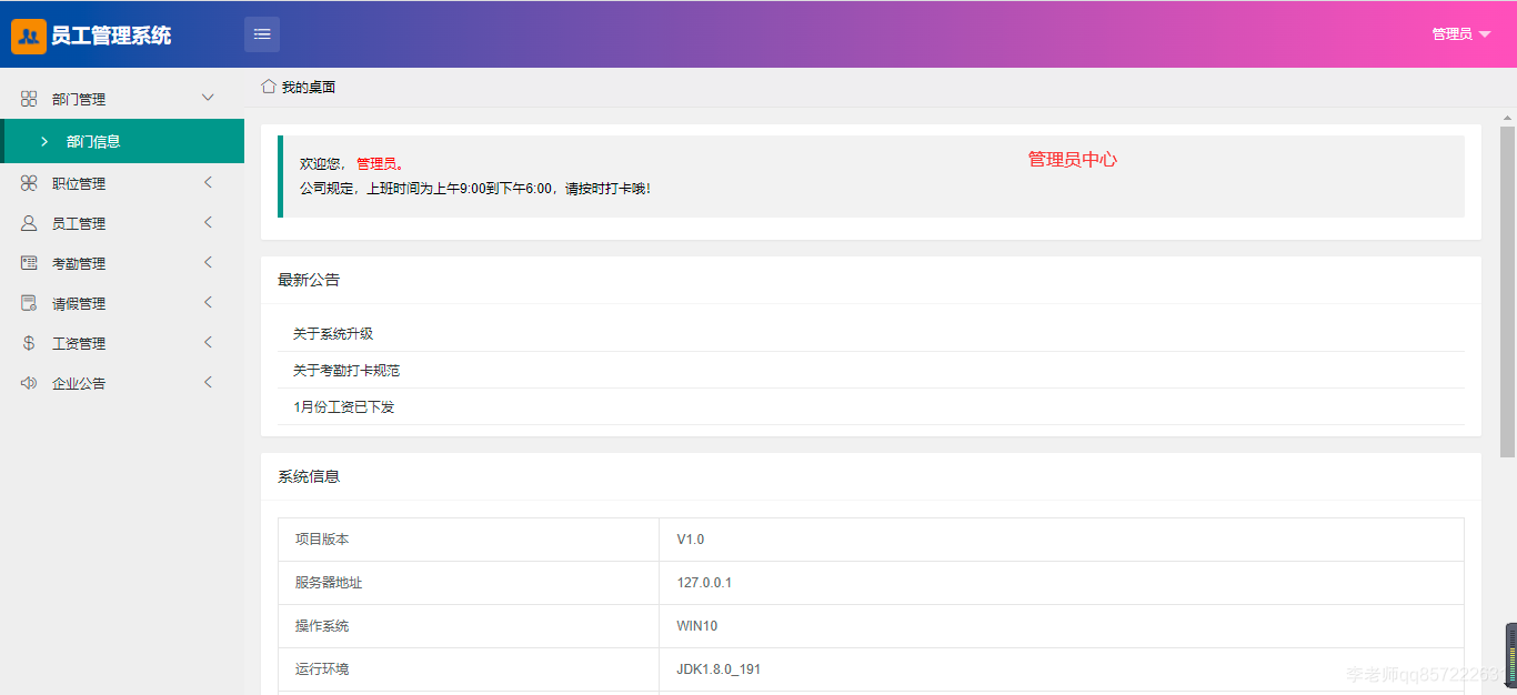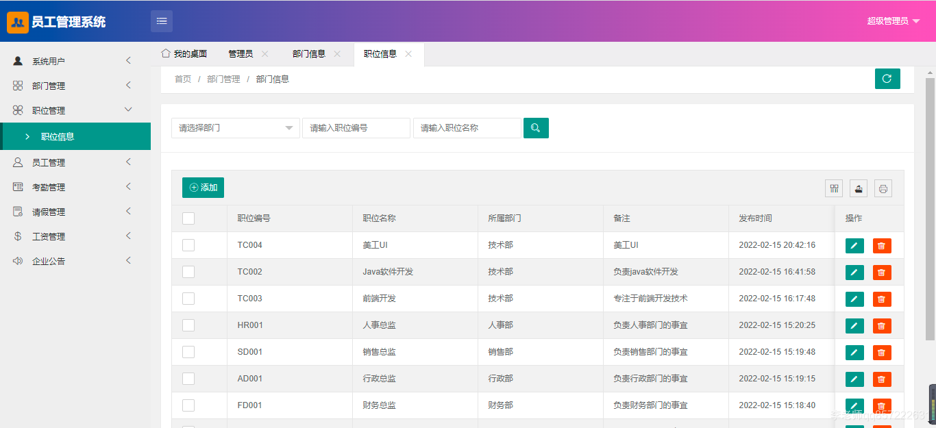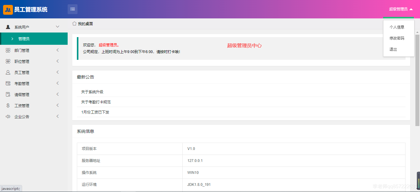超级管理员:管理员管理;部门管理;职位管理;员工管理;考勤管理;请假管理;工资管理;公告管理;个人信息修改;密码修改。