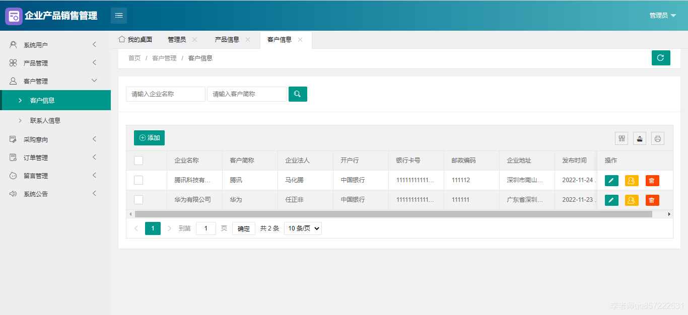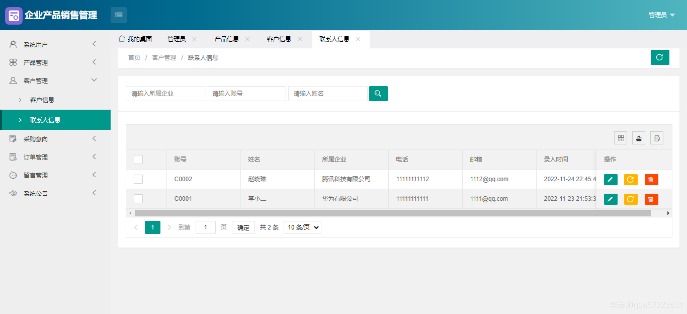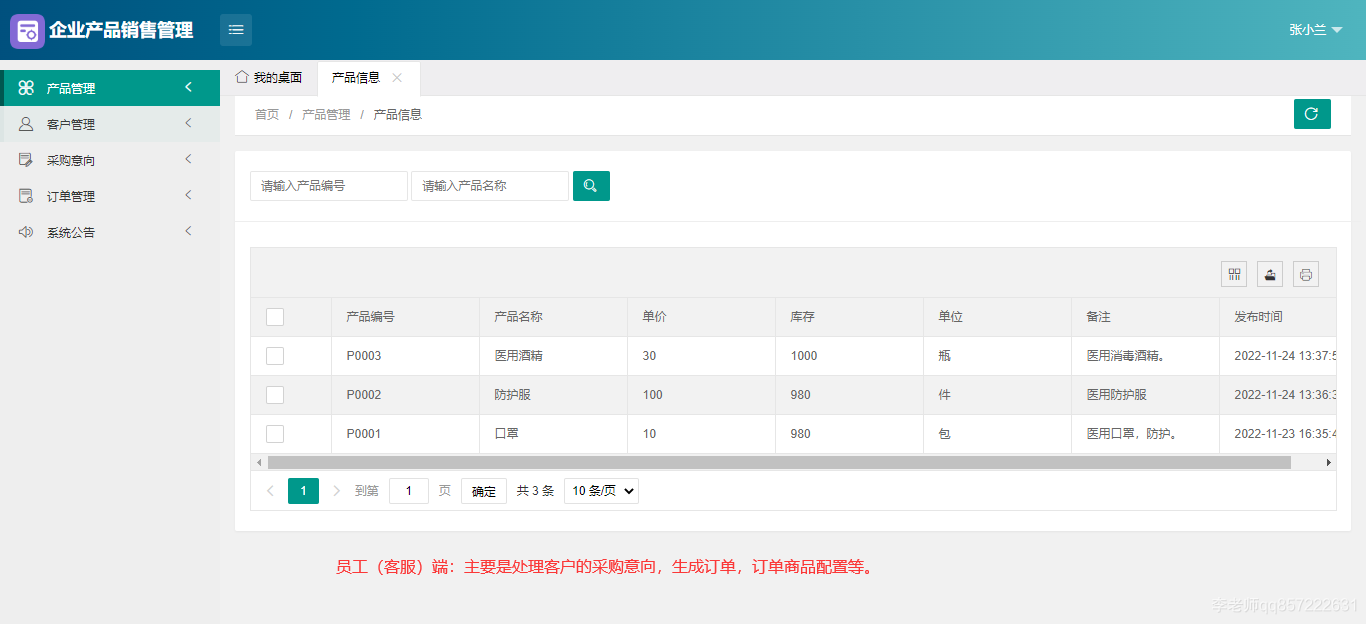 使用java+springboot+mysql开发的企业产品销售管理系统,系统包含管理员,员工(客服)、客户角色,功能如下: