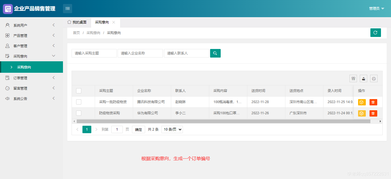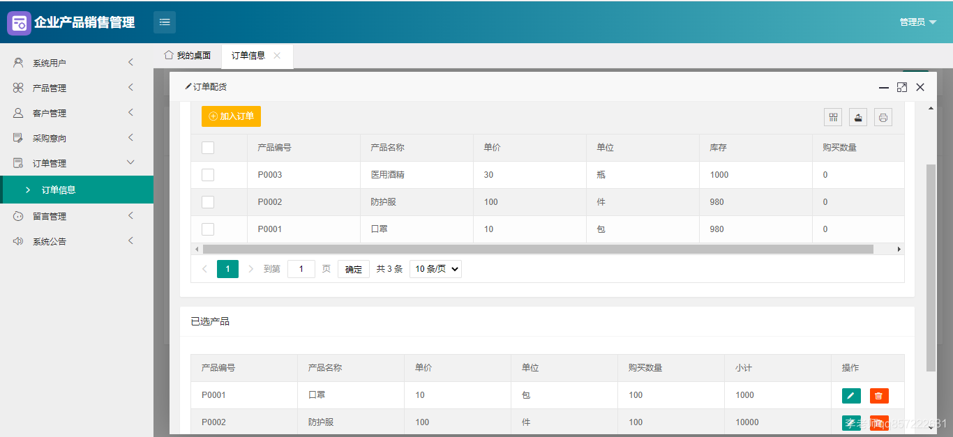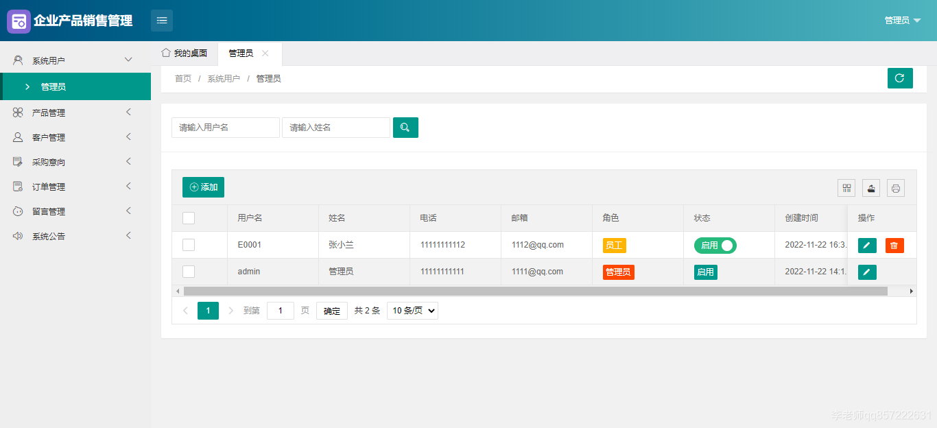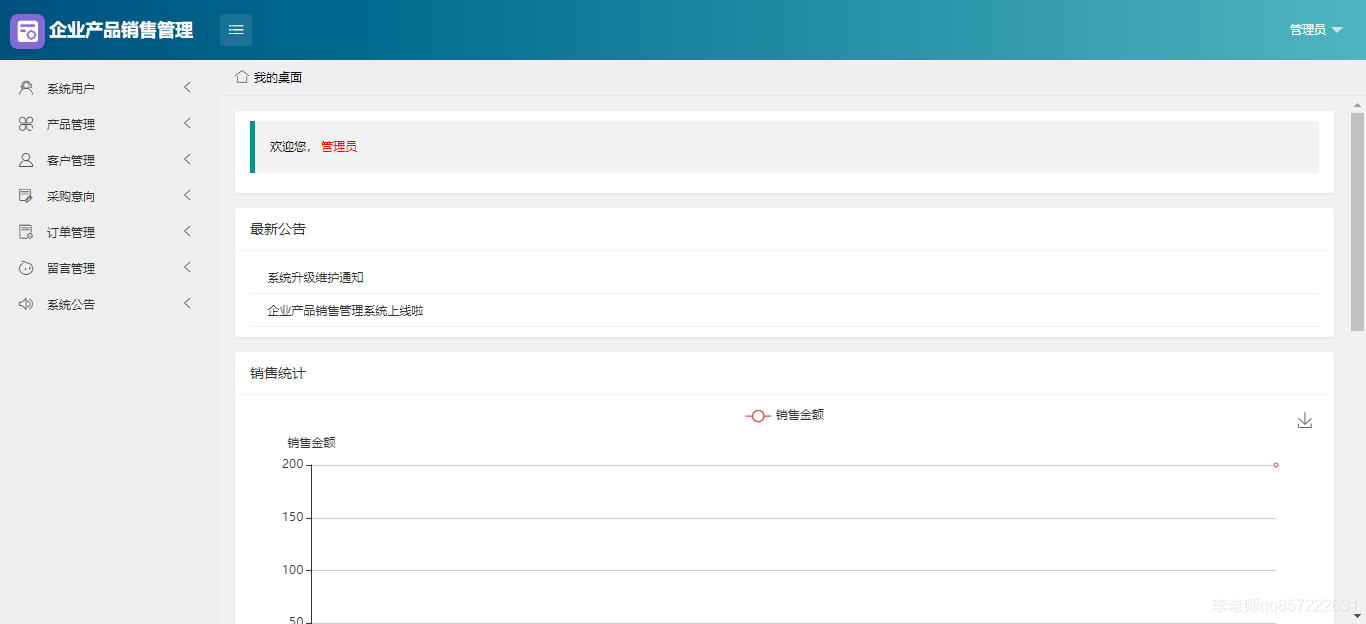 管理员:首页(销售统计);系统用户管理;产品管理;客户管理;采购意向(生成订单);订单管理(订单明细、提交);留言管理;系统公告;修改个人信息;密码;