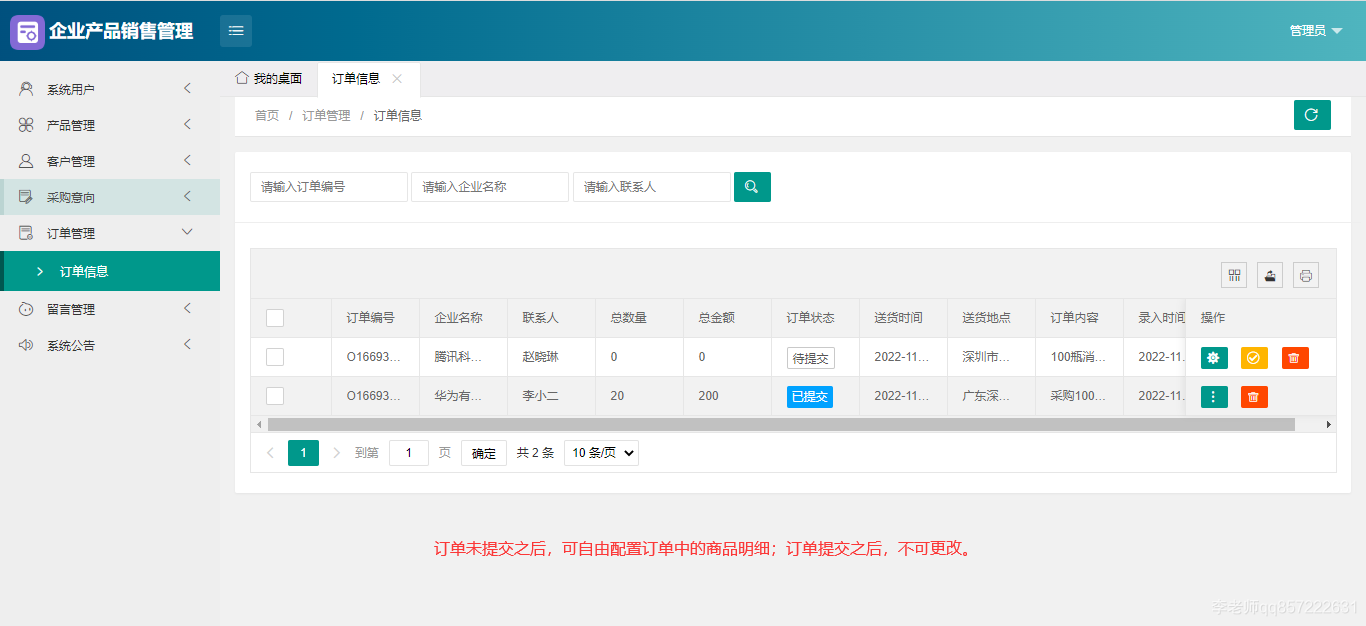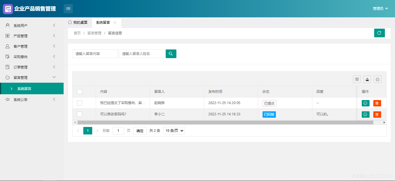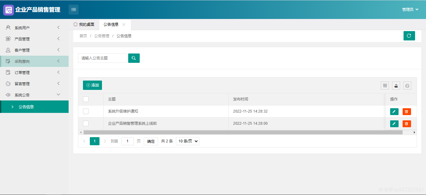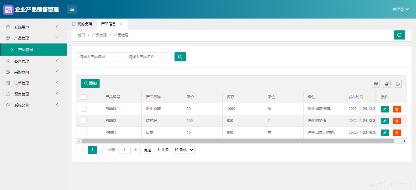 管理员:首页(销售统计);系统用户管理;产品管理;客户管理;采购意向(生成订单);订单管理(订单明细、提交);留言管理;系统公告;修改个人信息;密码;