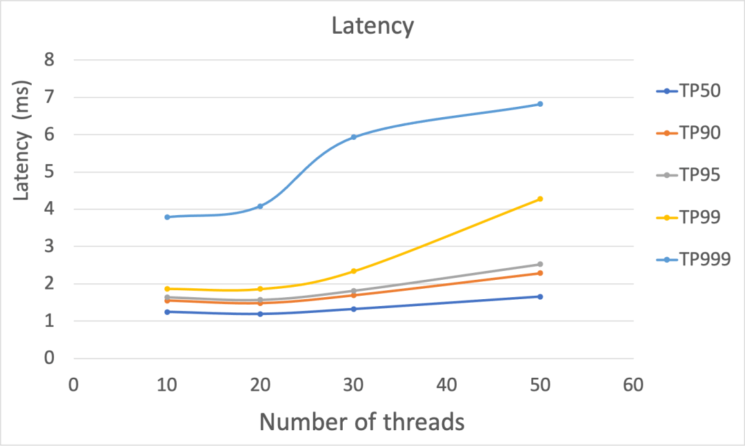 Figure-1 显示了在固定其他默认参数,线程数目变化的情况下,延迟和吞吐的性能表现。可以看到,随着线程的增加,请求延迟都呈现上升的趋势。而明显的上升拐点是当线程数为 20 时,增加线程数目会显著增加请求的延迟。总体来说,延迟均保持在个位数毫秒级别。对于吞吐,增加线程数目可以显著提升吞吐表现,在该较为复杂的场景下可以达到万级别的吞吐。