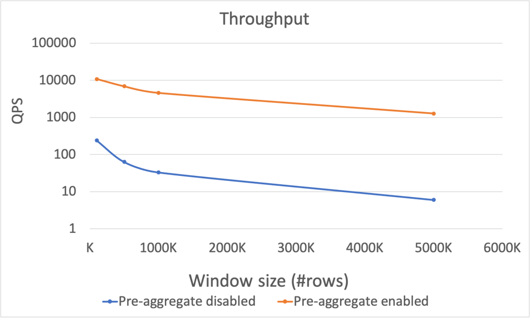 下图 Figure-3 显示了当在不同的窗口大小下,是否使用预聚合的吞吐性能表现:当窗口内数据行数变多,两种情况的吞吐性能都呈现下降趋势,但是开启预集合技术的吞吐量远远高于不使用的情况,而且当窗口变大时,这样的差距更加明显,超过 200 倍。注意,由于两者性能差距巨大,以下图片纵坐标使用了对数坐标。