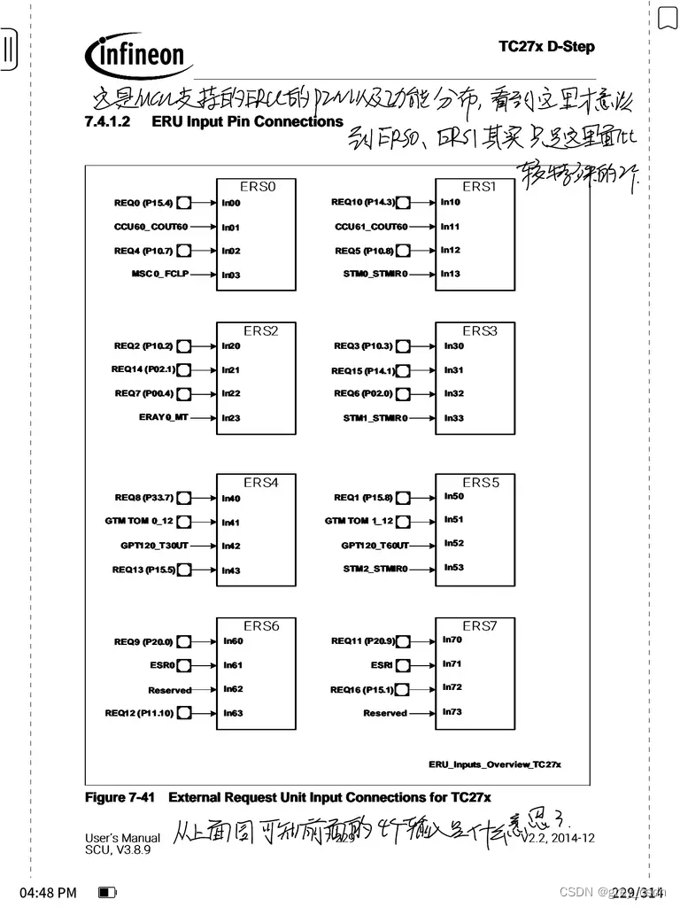 - 这个是MCU支持的ERU的PIN以及功能分布,看到这里的时候才注意到之前一直接触的ESR0以及ESR1只不过是这里面比较特殊的2个。
