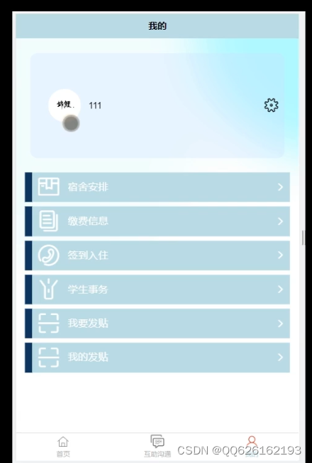 (b)用户进入程序前台可以实现首页、互助沟通、我的等功能
