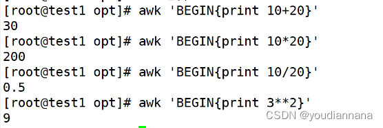 awk运算: awk 'BEGIN{print10+20}'