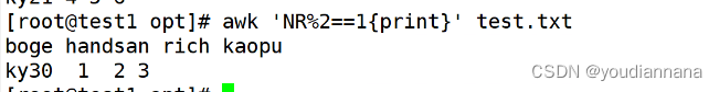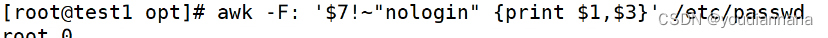 $0:打印全部内容 $n:处理行的第几列 NR:处理的行的行号 NF:处理当前行的字段个数,$NF就表示最后一个字段 FS:列分隔符,指定文本的分隔符,和F作用一致,-F:FS=“:” OFS:输出文本的分隔符 RS:指定分隔符为回车 内置变量$n要加$,其他的内置变量不能加$,更不能用引号,也不能用括号,否则会被当成字符串来处理